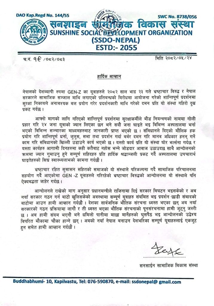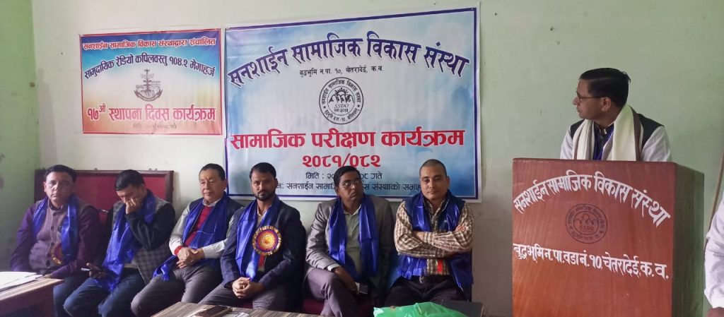 established in 2055 Bs (1998AD) as a Sunshine Youth Club by some local Youths and registered in the same year in the district administration office, Kapilvastu under the social organizations act 2034 BS. It is affiliated with social welfare council and NGO federation Kapilvastu. It has been working in the field of extreme poverty especially for dalit, janjati, women, and children and source less people who are deprived from basic needs: health, education and drinking water. It focuses its programs in the socially, politically and economically excluded communities for their mainstreaming. Social justice is the motto of the organization.